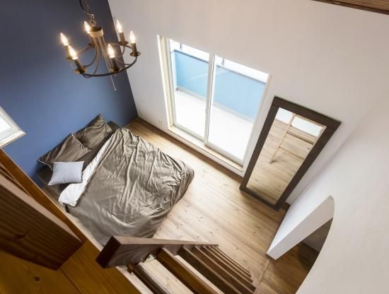 外観は個性的に、ブルーの漆喰で仕上げました。