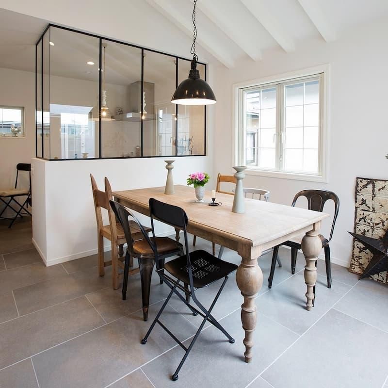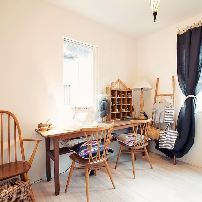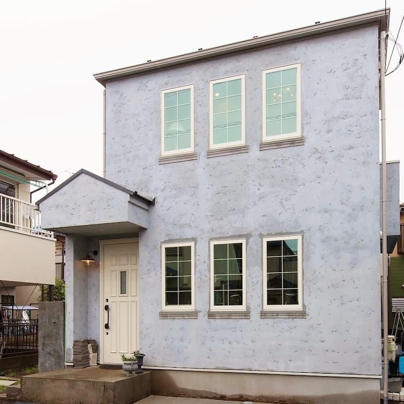 ブルーグレーの壁とホワイトを塗り重ねたパイン材は