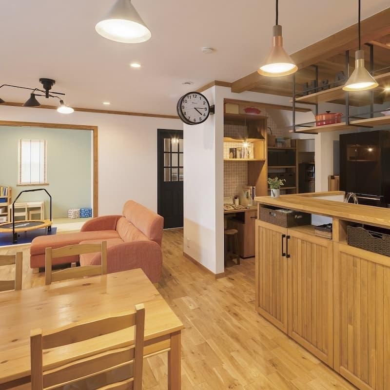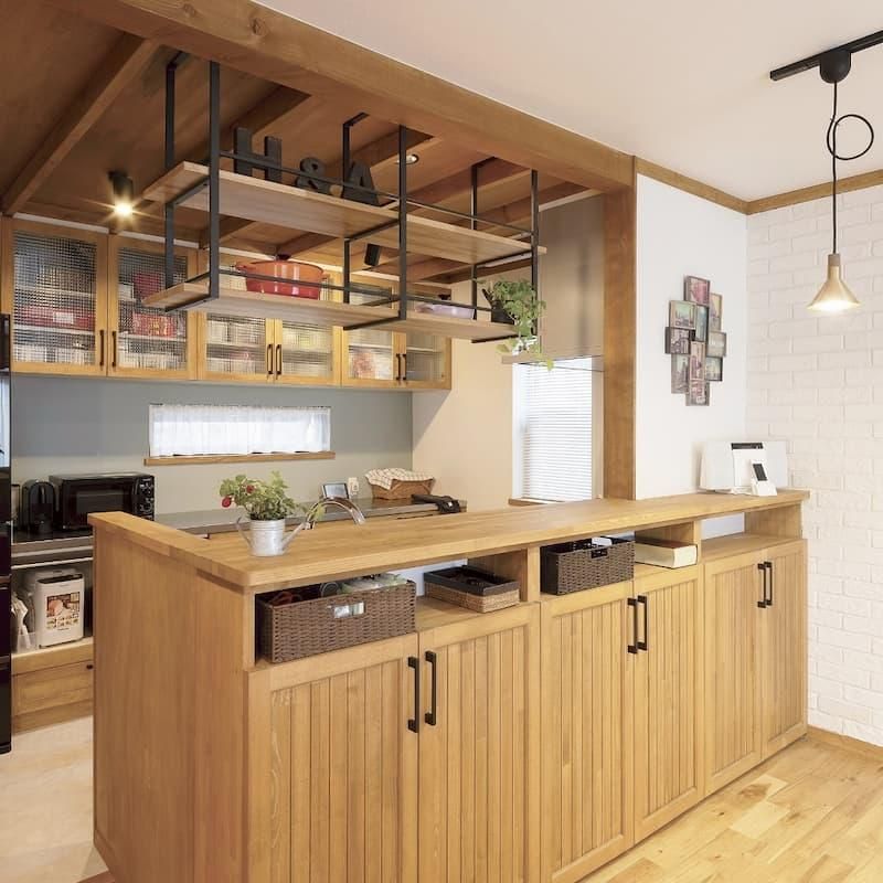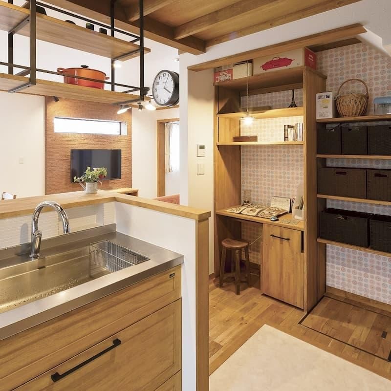キッチンと収納棚は市販品を無塗装で仕入れ、