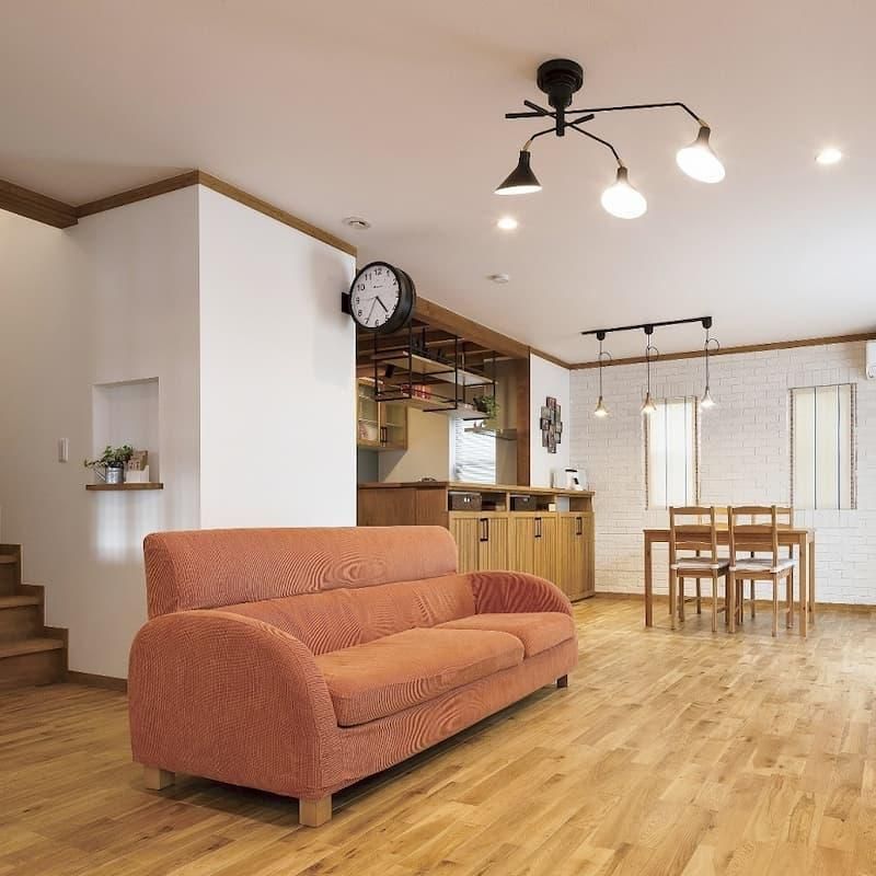 深い色合いでまとめた大人気ヘリンボーンの床。