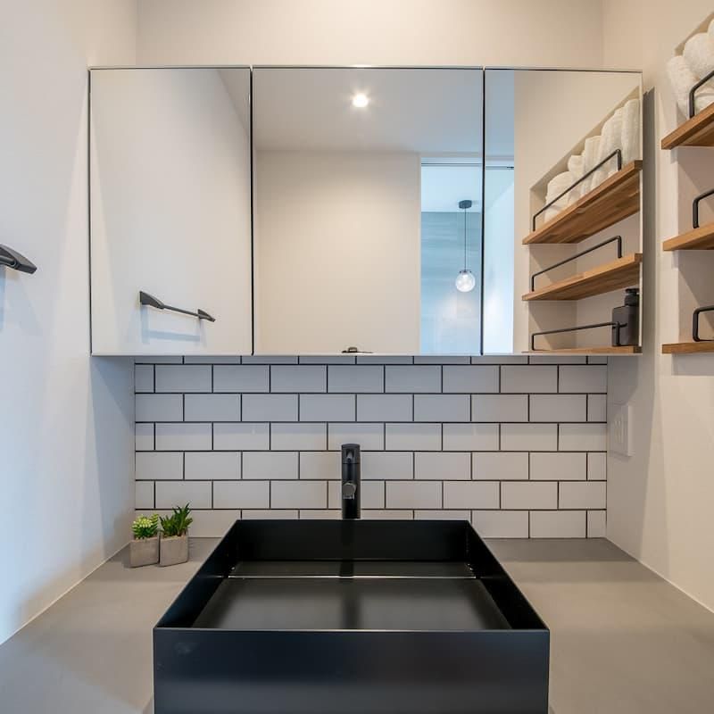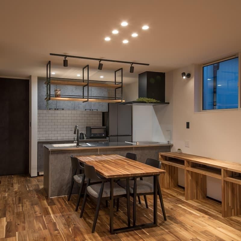 ブラック×無垢材で統一したLDKや鉄骨階段は