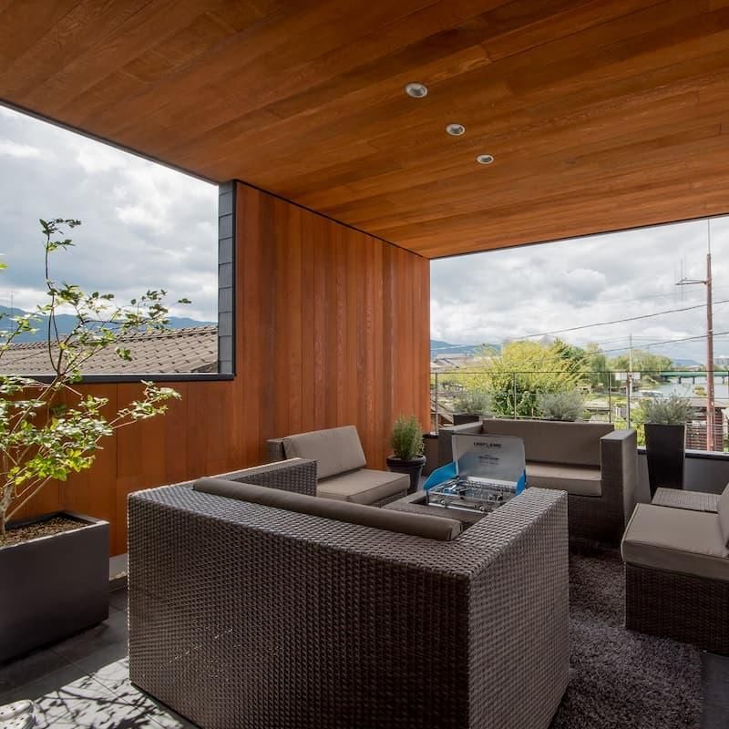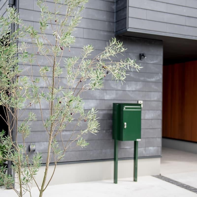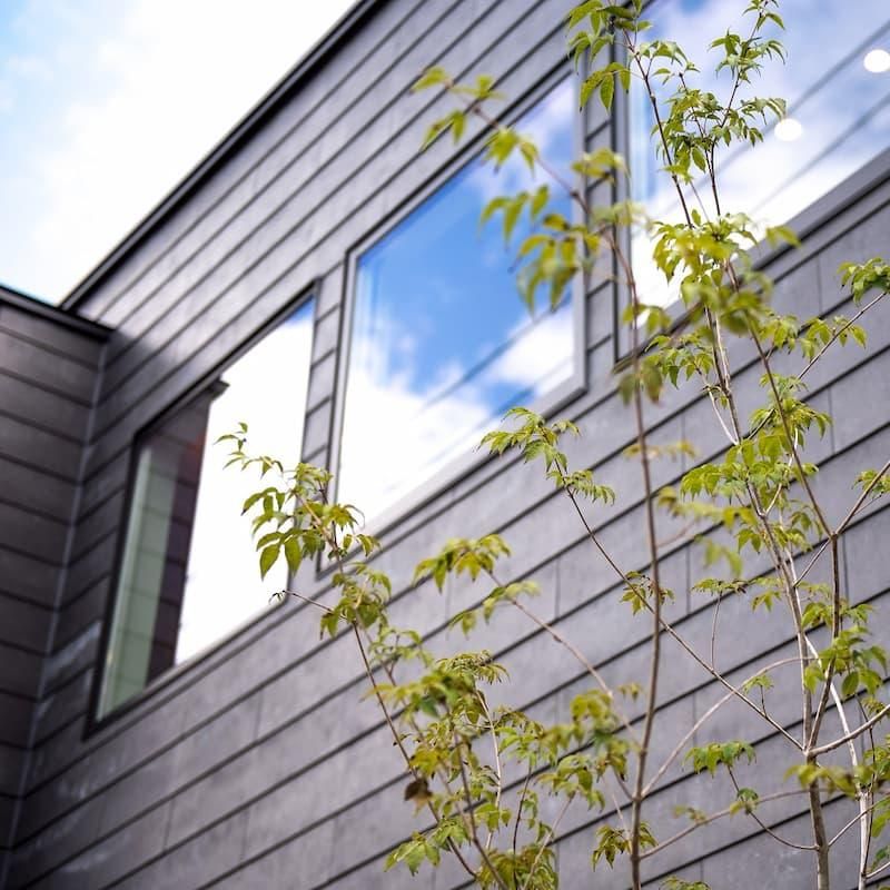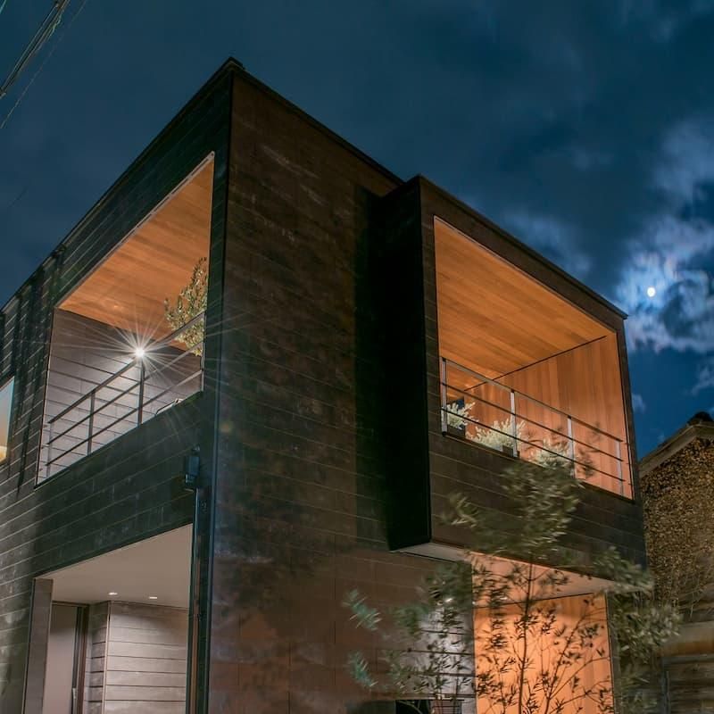 黒の外壁にレッドシダーが映える