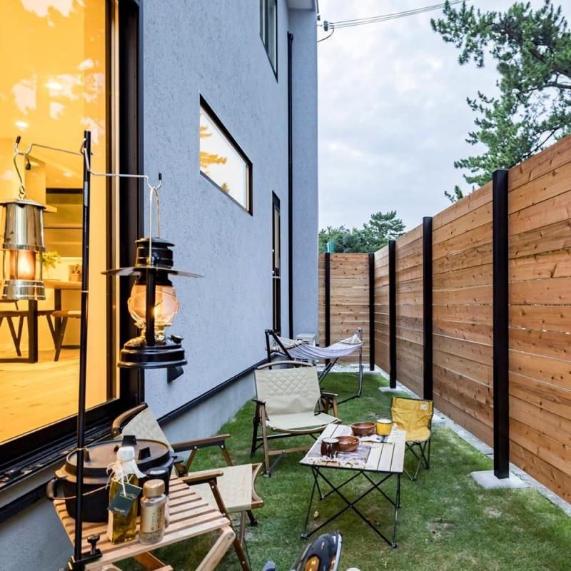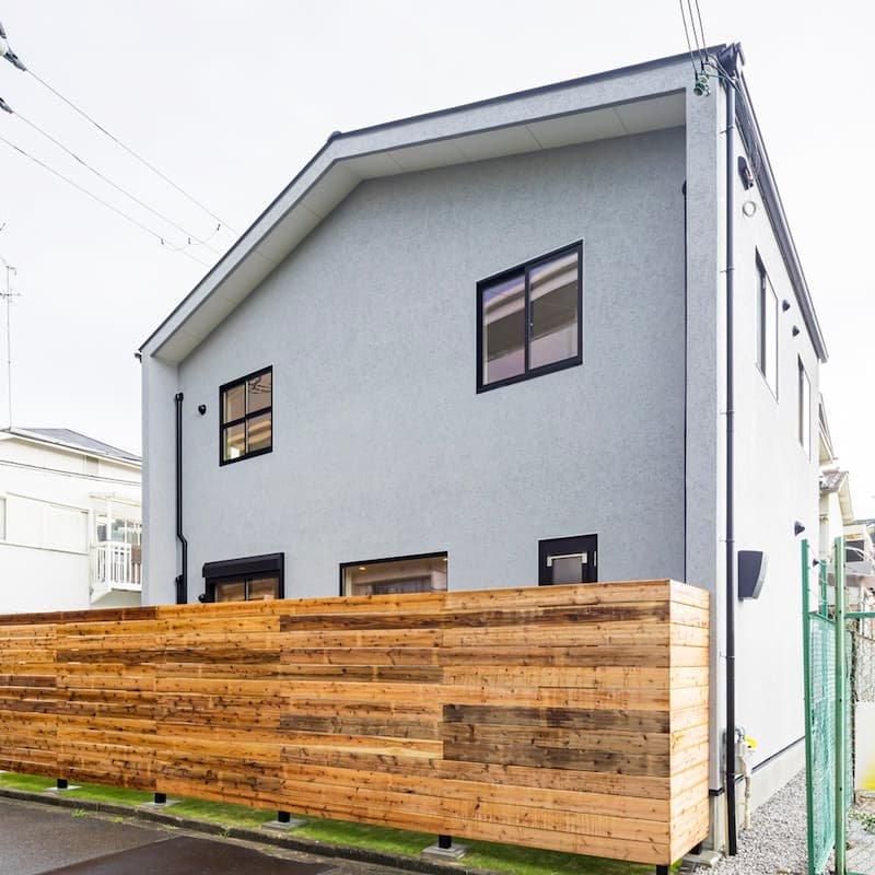 グレー塗壁に三角屋根のおしゃれな2階建ての家。