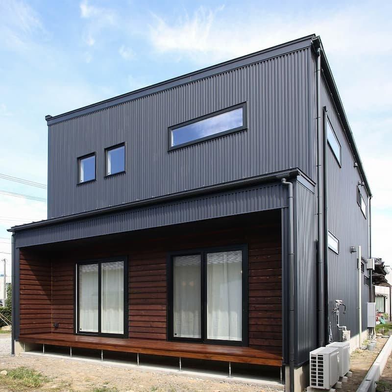 外観は黒ガルバ×無垢板アクセントウォールの
