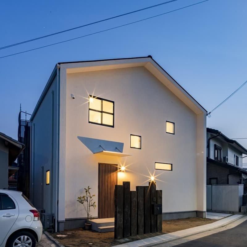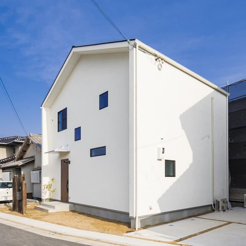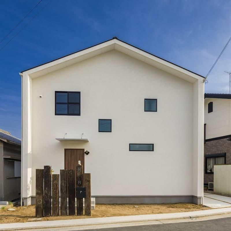 切妻屋根が印象的な白い外観の家。