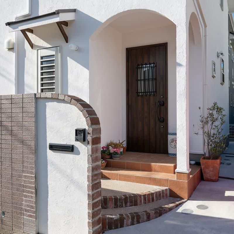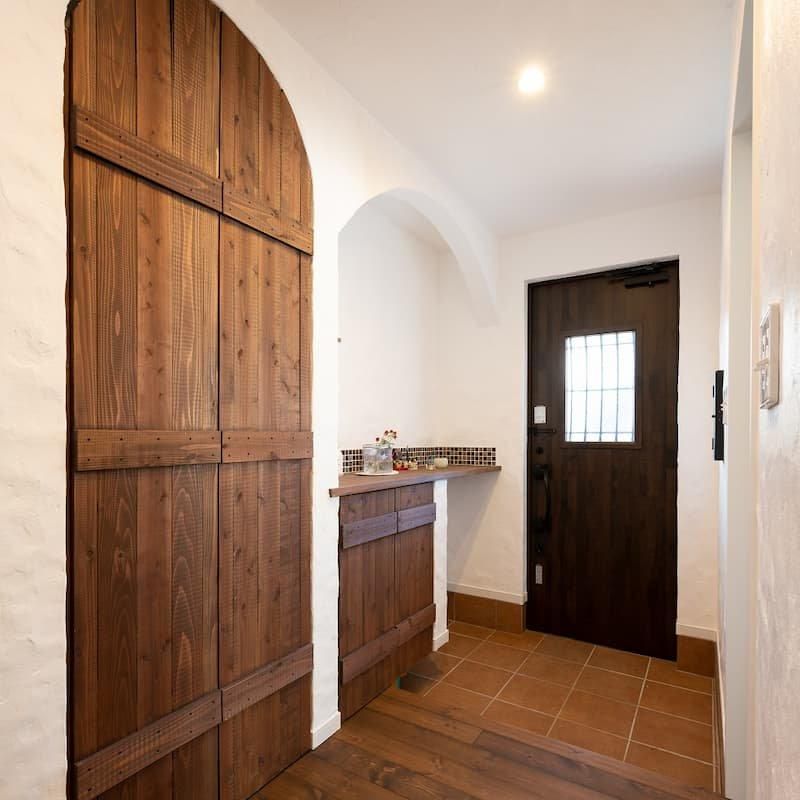 ブラウンのタイルと優しいグレイッシュブルーのドアが