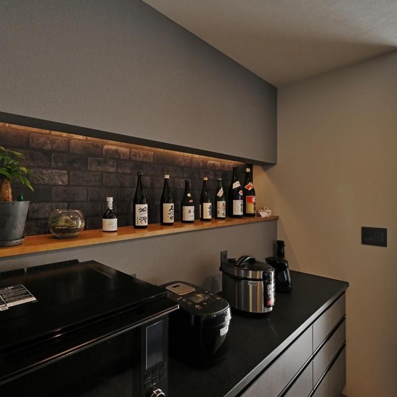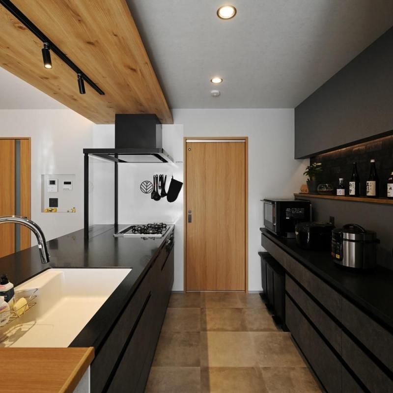 システムキッチンはダークグレーでスタイリッシュに。