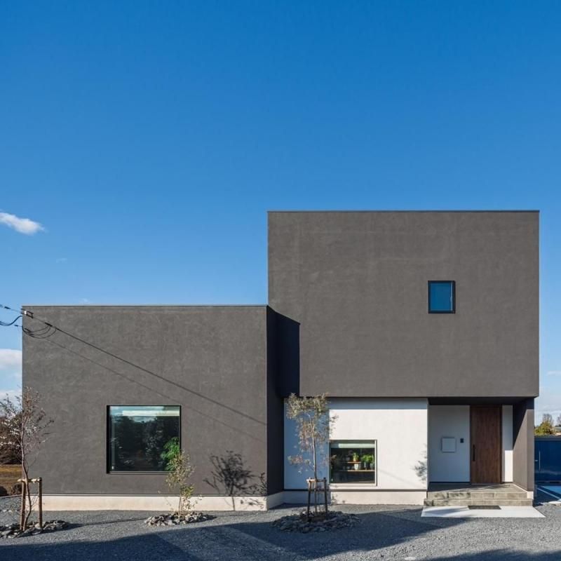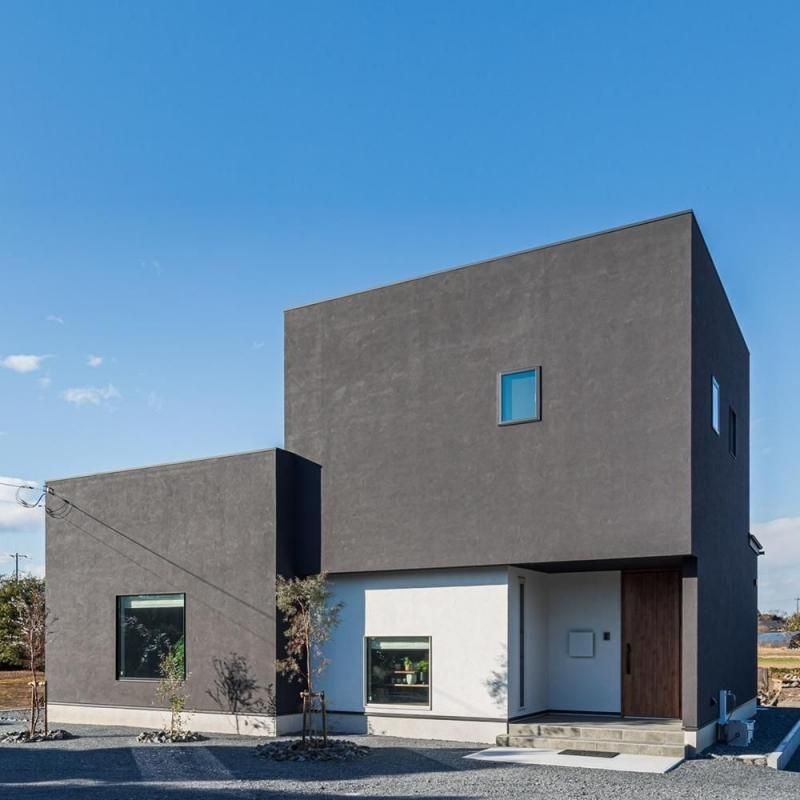 ブラック×ホワイトの塗り壁仕上げの外観が
