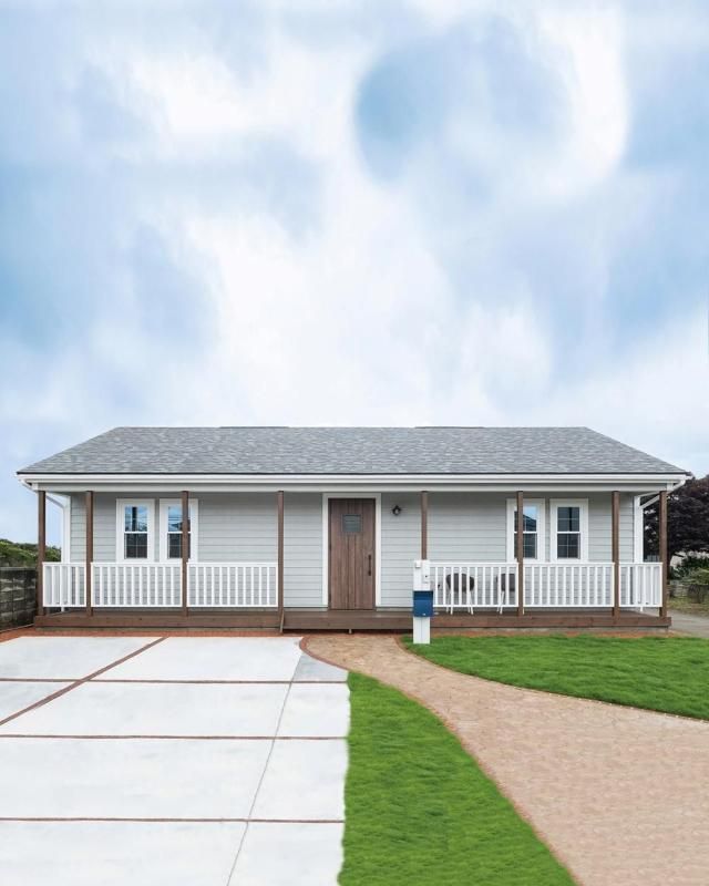 玄関ドアを中心にシンメトリーに伸びる姿が