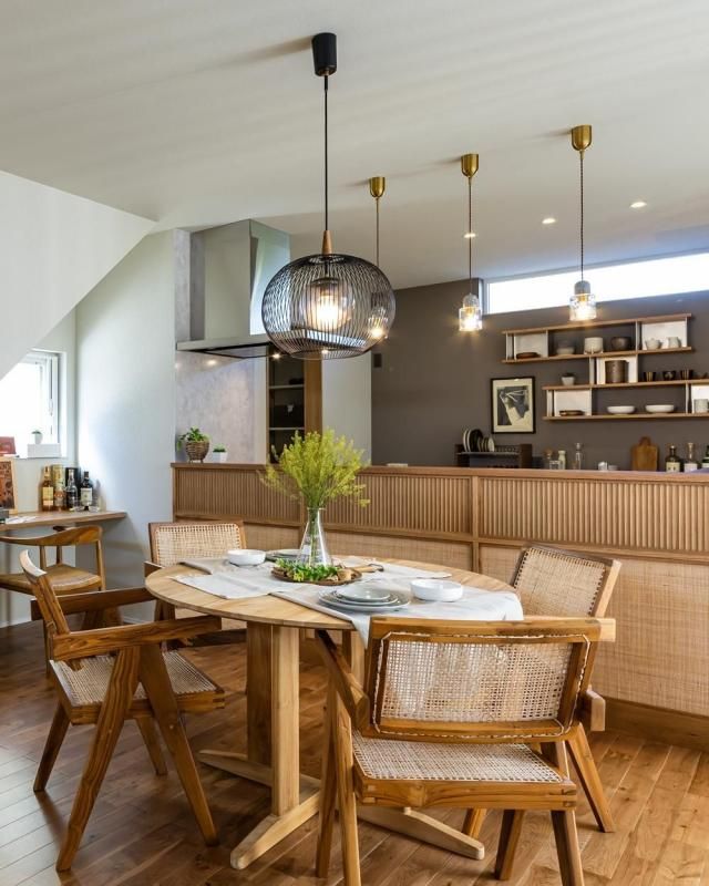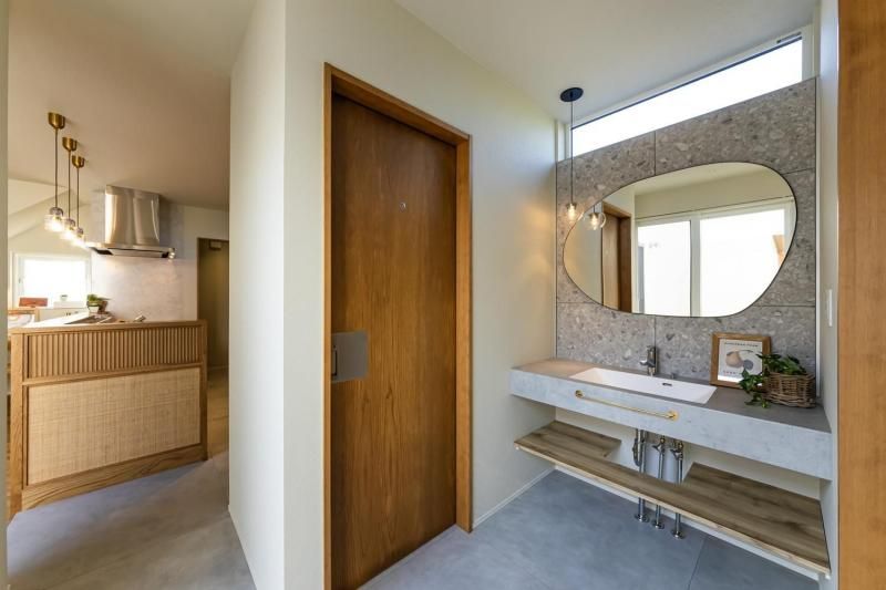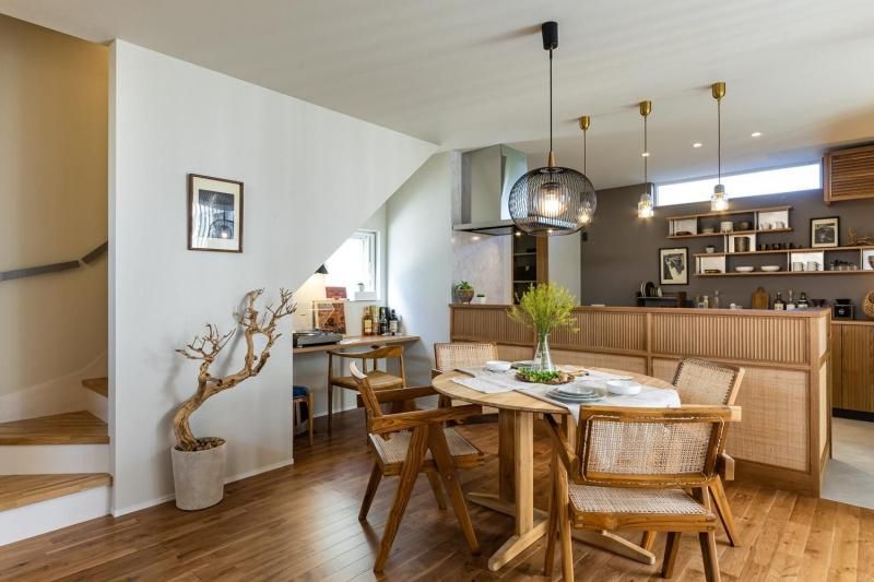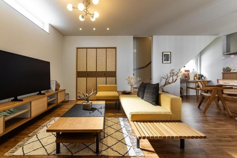 ラタンの建具や大谷石をあしらったアクセントウォールなど