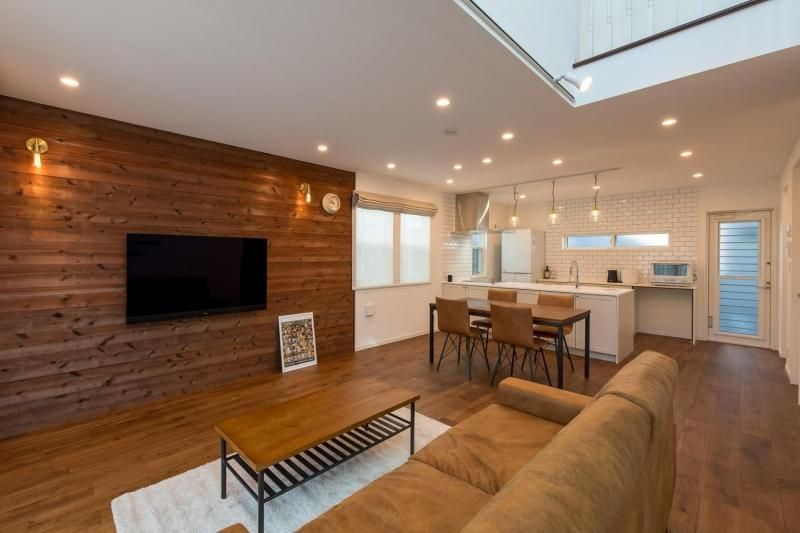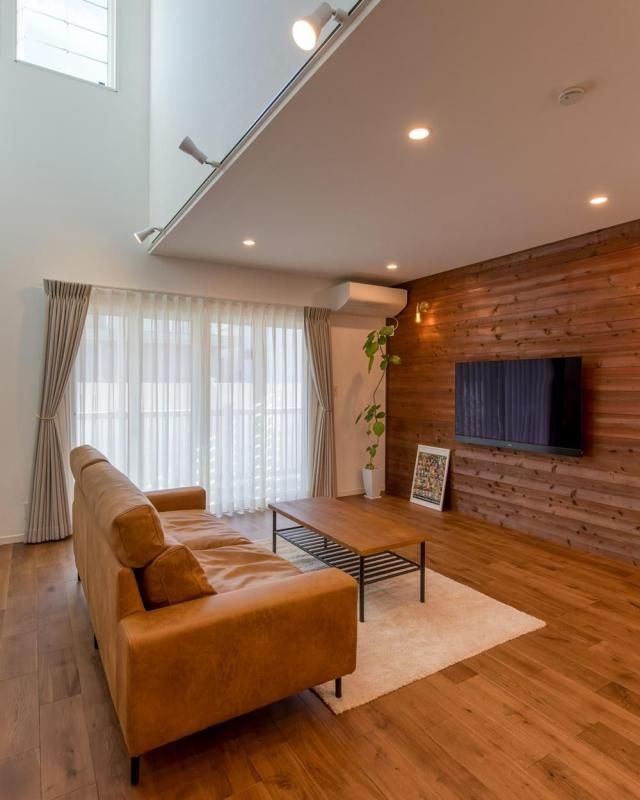テレビ側の壁面には濃い目の木材を板張りにし、