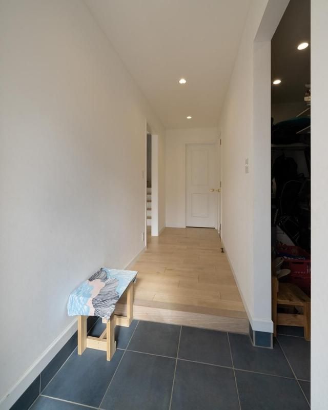 玄関ドアを開けると、爽やかな青のタイルが印象的。