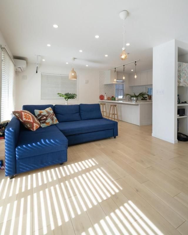 アクセントカラーであるネイビーのソファが目に留まります。